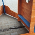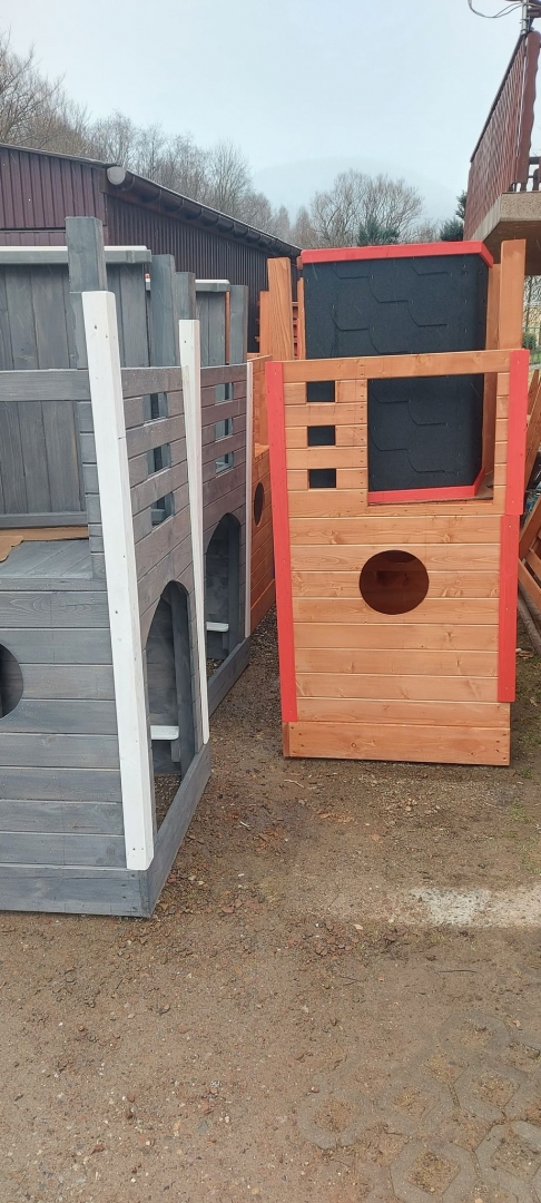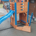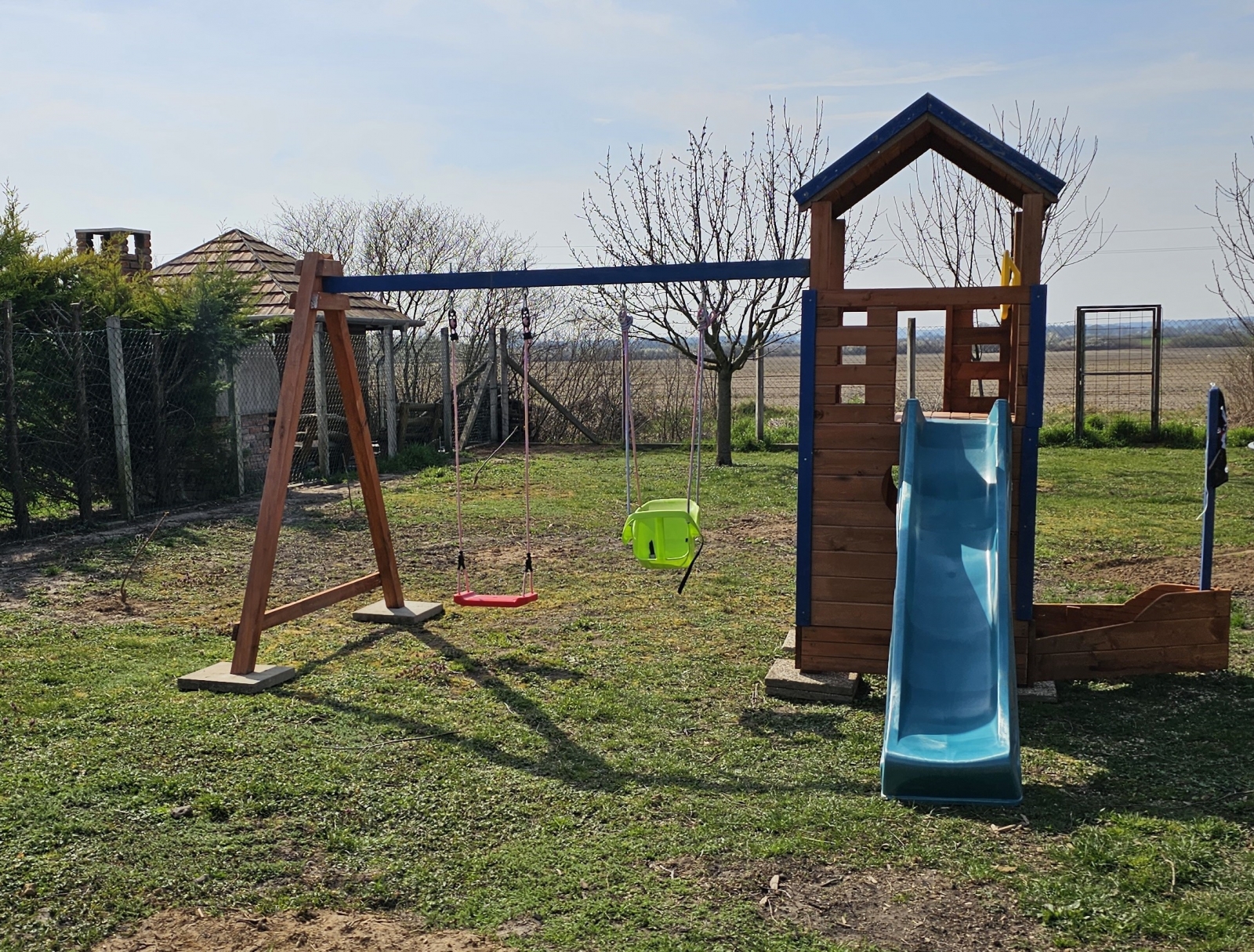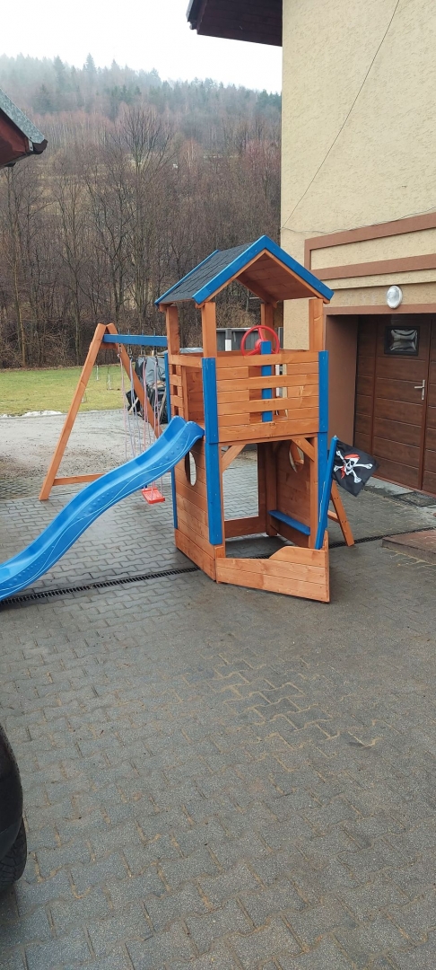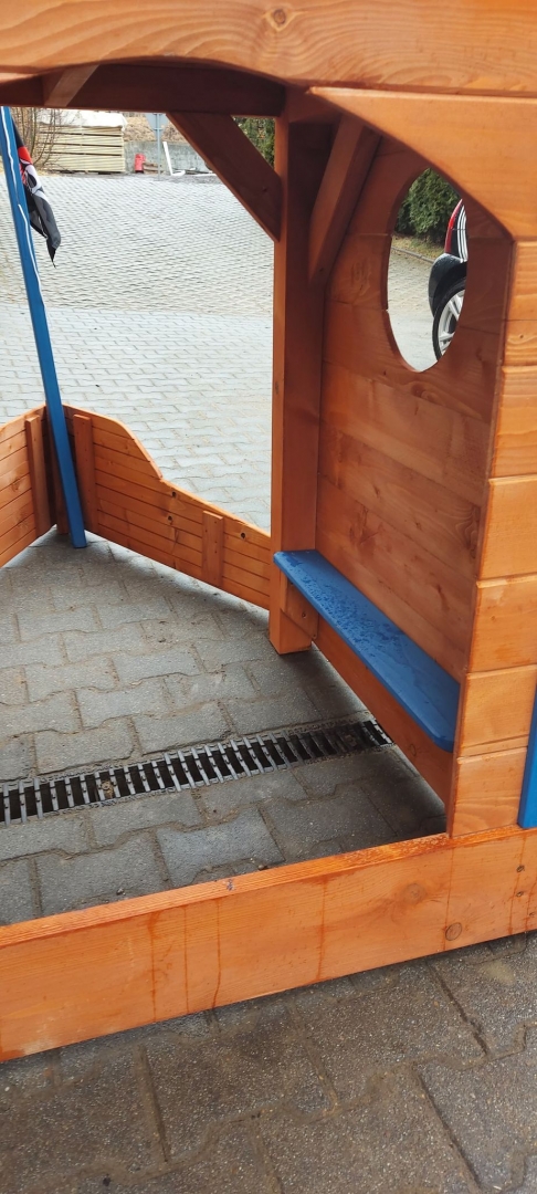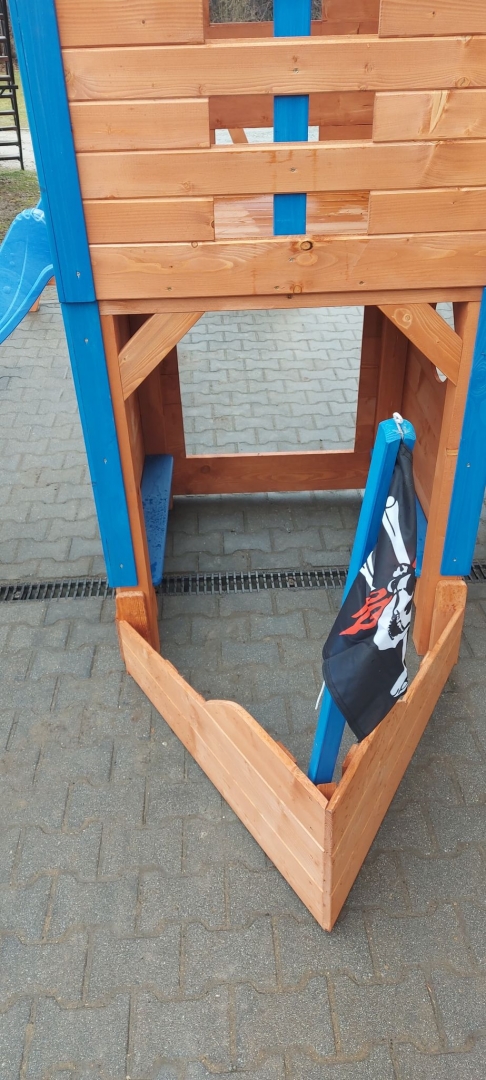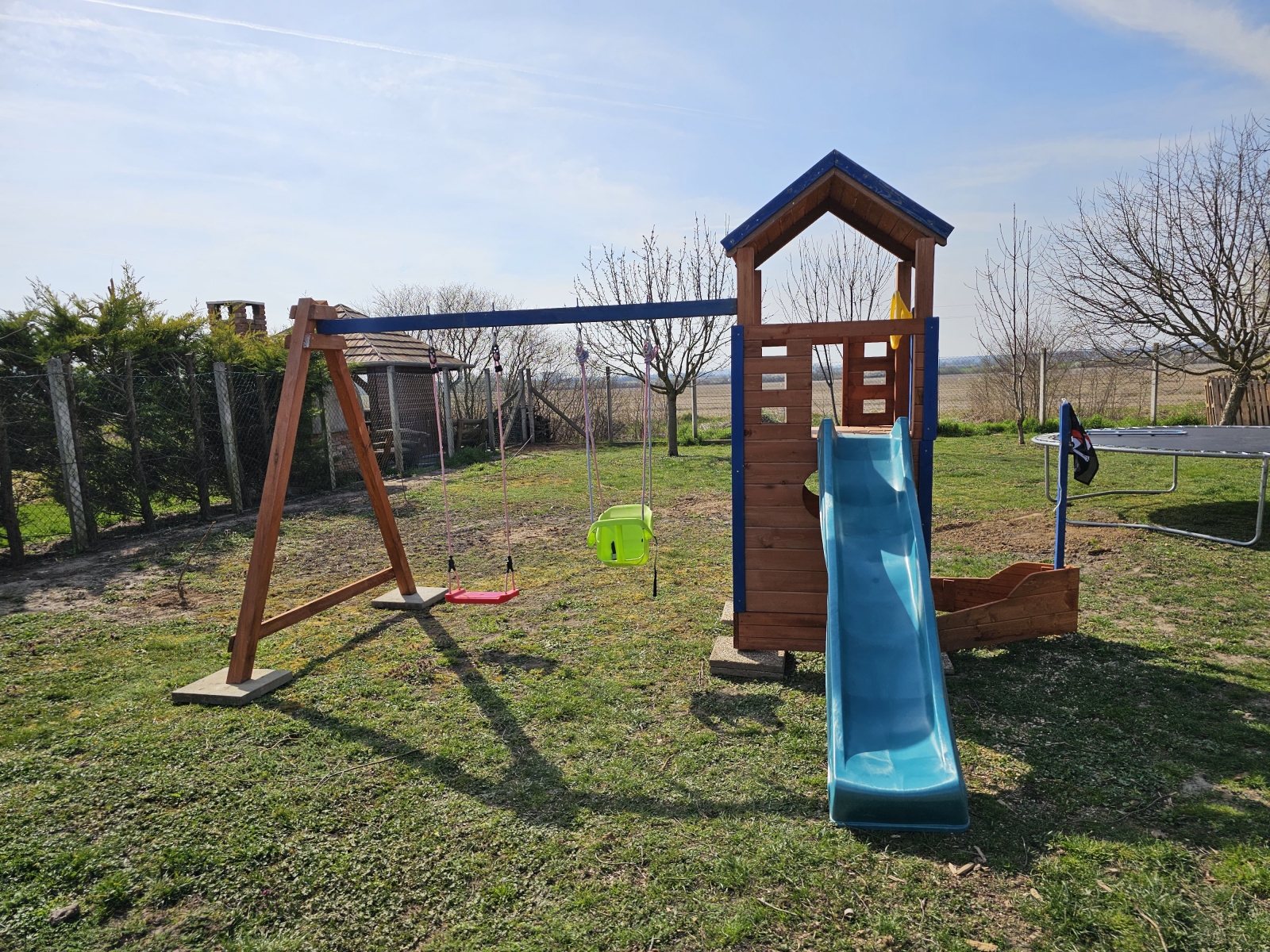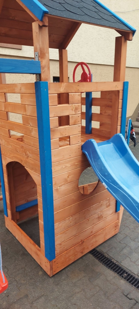 Hajós játszótér Tartós,masszív fa szerkezet. Anyaga : időjárásálló borovi fenyő. Felületkezelés: 2 x vékonylazúrral, integrálva. Torony: 120 x 120 cm ,alatta ugyan ekkora házikó homokozóva, 2 ,5 m csúszda és két kiállásos hinta állvány 2 db laphintával .